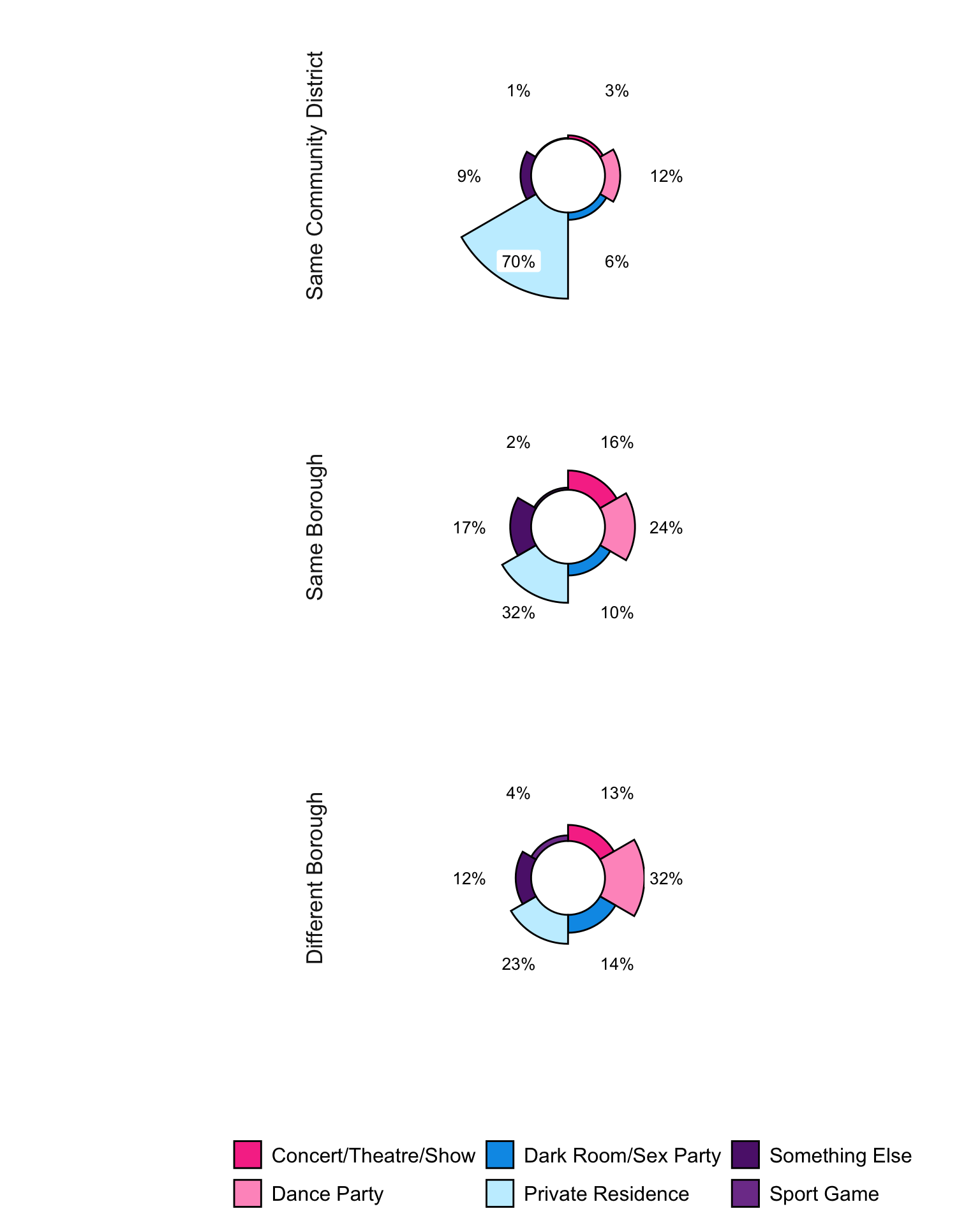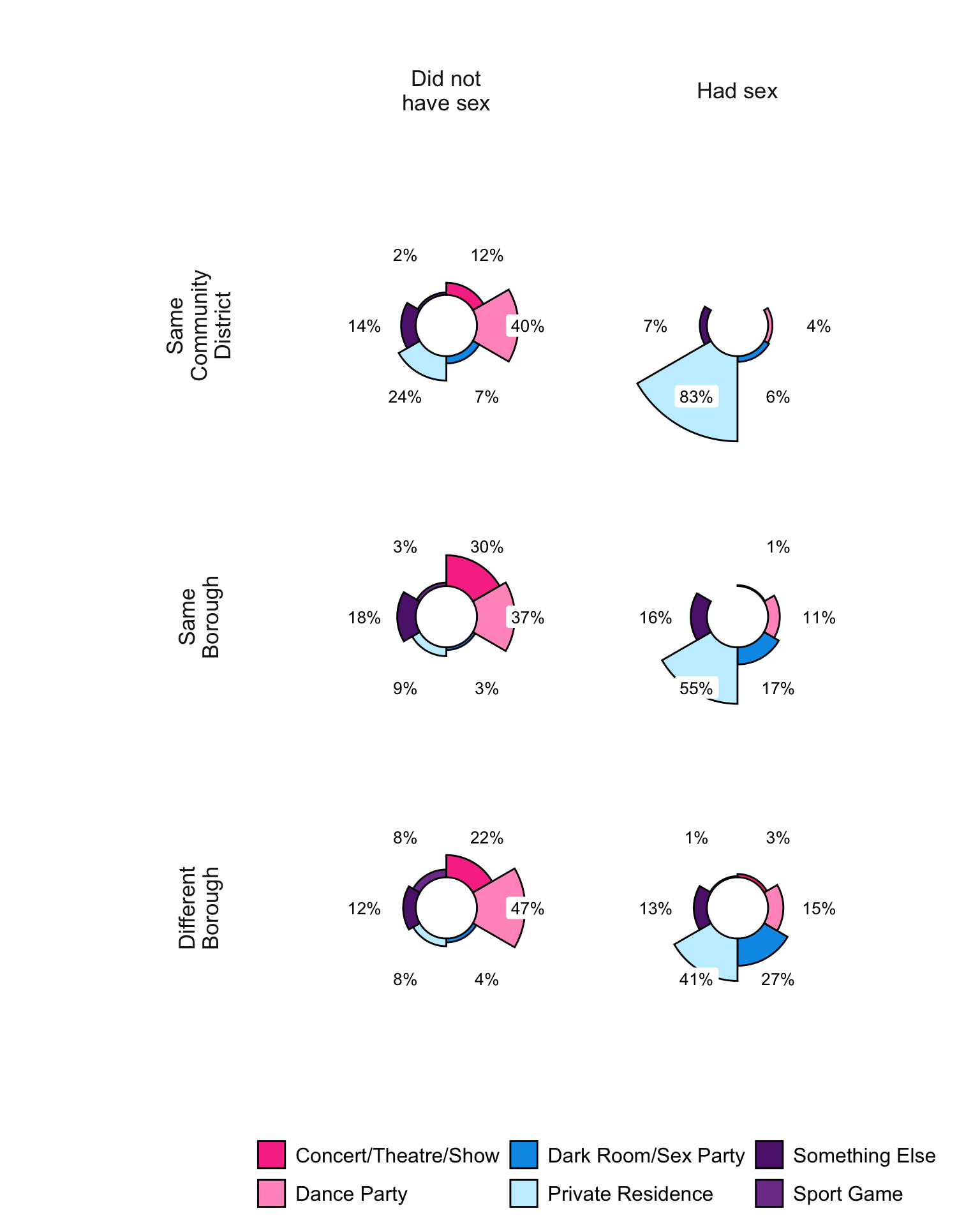 draw_table_3("Venue type by home distance and sexual contact")| Venue type by home distance and sexual contact | ||