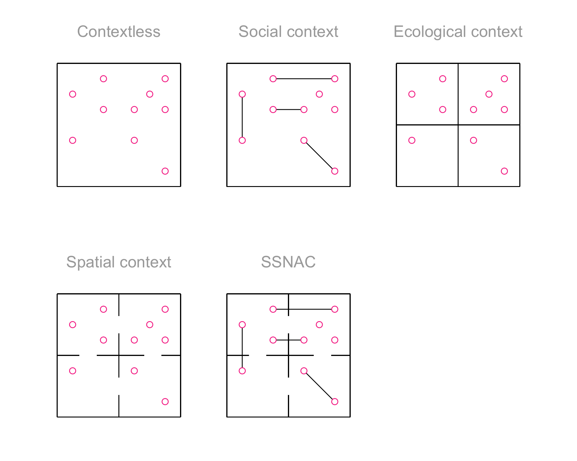 A SSNAC analysis (final frame, Figure A.1) would integrate knowledge about patterns of interaction between individuals, within spatial units, and across spatial units to gain a granular understanding of risk. We could assume that the risk of acquiring a cold is a function of i.) interactions with one’s own household members; ii.) interactions with members of neighboring households; and iii.) interactions in personal relationships within and across households.
