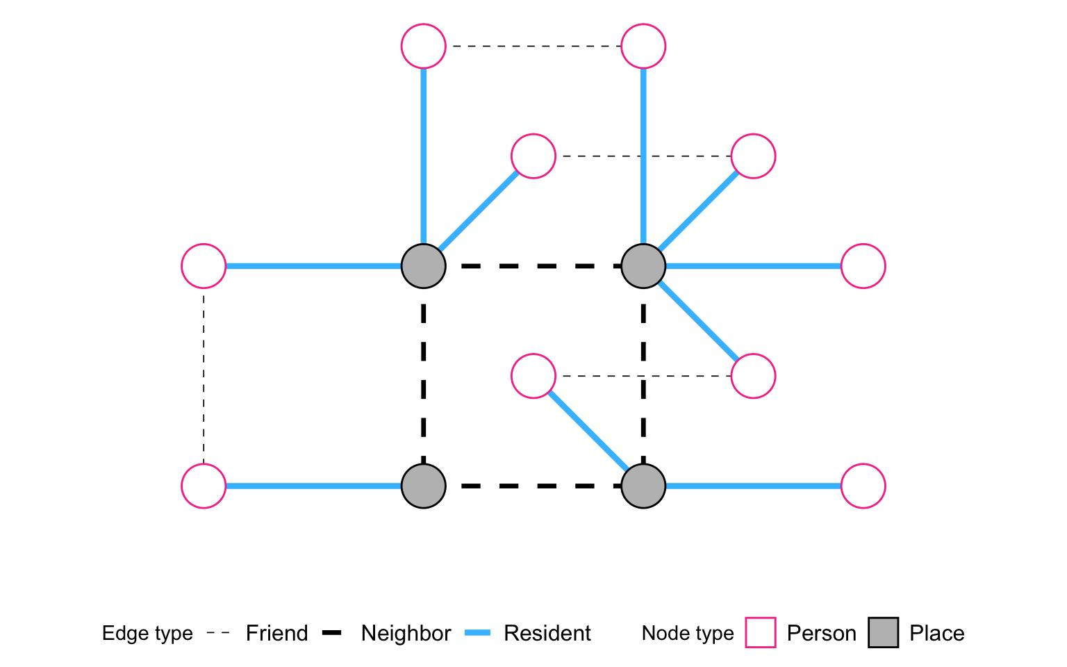 The data graph is a starting point for constructing a causal model, but it is not sufficient. Depending on the causal question, some edges in this graph are relevant and some are not. For example, if we were interested in a rumor network, we might decide to depict only people and not places in the causal graph. We might also choose to ignore the neighbor relation and focus only on friend and co-resident relations if it is the case that rumors are transmitted within households and across friendships but not to neighbors.