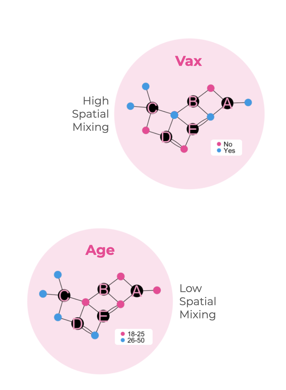 The spatial mixing ratio is a positive real number greater than 1 when members of the first subgroup are more likely than random to share community districts with members of the second subgroup, and between 0 and 1 otherwise. It is calculated as the average (across all individuals) of each person’s spatial preference for the second group divided by the second group’s overall prevalence in the sample. Preference is defined as the number of connections to individuals of the second subgroup as a proportion of total number of connections. The spatial mixing coefficient is the spatial mixing ratio minus one.