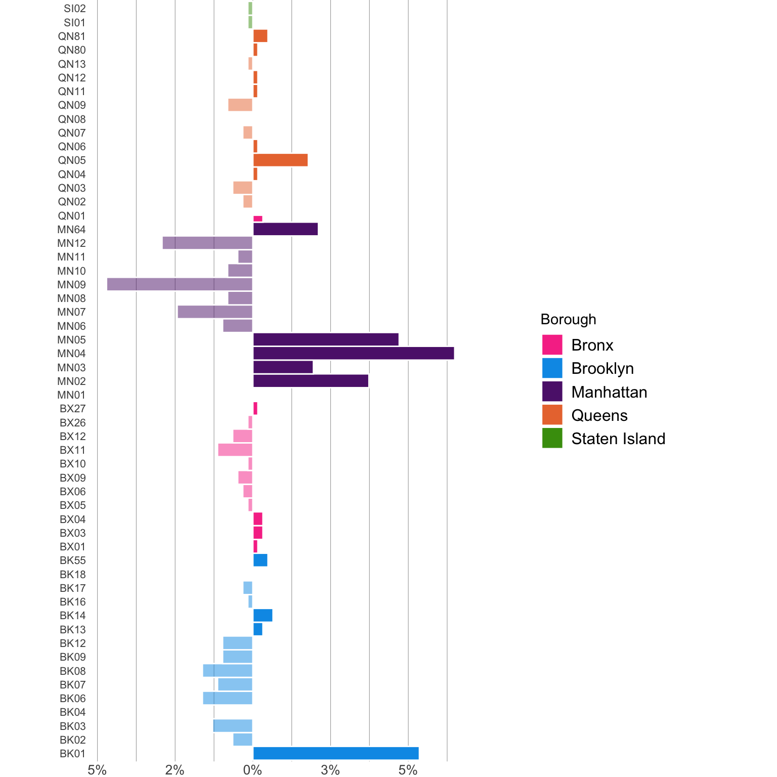 Figure 8.2 compares the share of primary residences and gatherings across community districts. Within each borough, a few districts were over-represented among gatherings relative to where participants lived—specifically BK01 (Williamsburg–Greenpoint), MN04 (Chelsea-Hudson Yards), and QN05 (Ridgewood). These places mark the city’s social centers: where people converged for nightlife, group gatherings, and sexual contact, amplifying both community connection and opportunities for transmission.