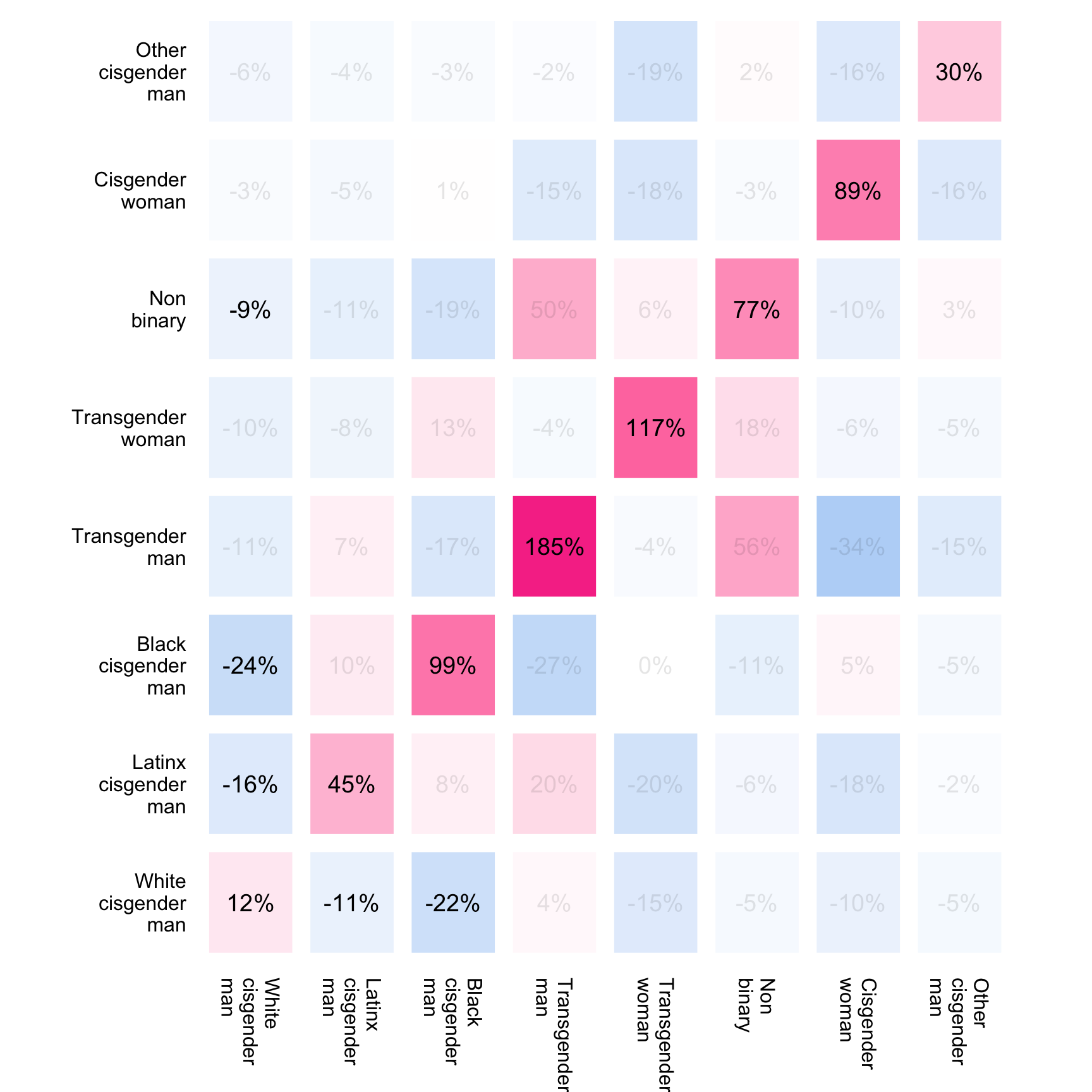 | Latinx cisgender man | Other cisgender man | -2% (-16 to 12) |